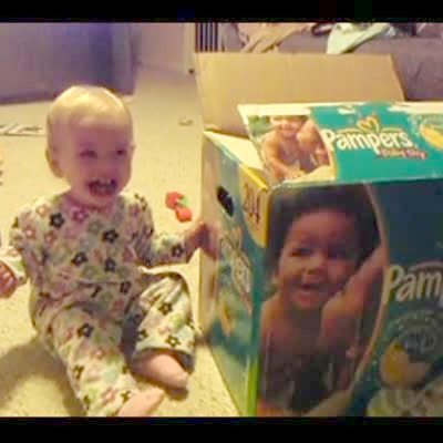 Baby peeks her head into a box hole, a cat pokes its paw out at her face. Low lighting.