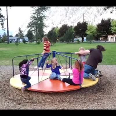 Dad rides, pushes kids on merry-go-round at playground, tot boy almost falls/flies off, man grabs him with one hand.