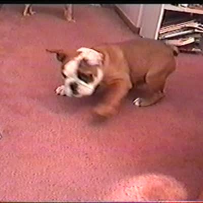 Small bulldog puppy chases a flashlight beam around the floor. Dog's head jerks from side to side trying to follow light. Cute