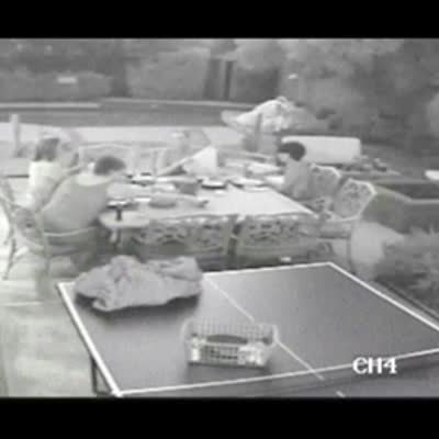 A group of teen girls and boys do a pyramid stunt in the living room. When the last girl climbs on top, she hits her head on the ceiling and breaks the light.