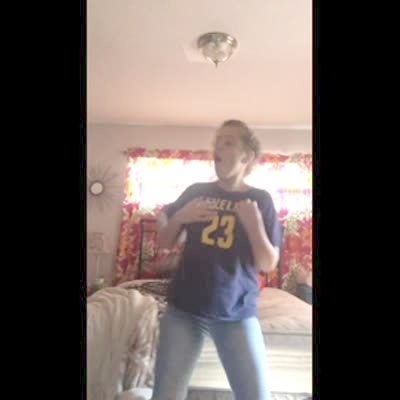 A teen girl dances on a bed in a bedroom and bumps her head into the ceiling fan light and breaks it and she falls off the bed. Music rights not cleared.