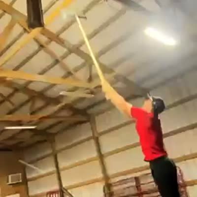 A teen boy uses a pitchfork to knock a broken light down in a barn, but the light falls and hits him in the head.