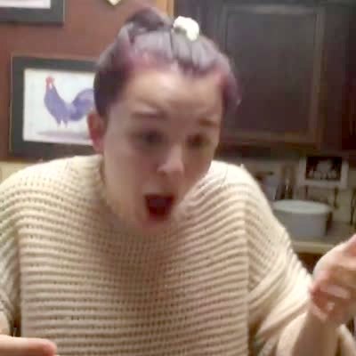A young woman tries to do the Whipped Cream Challenge, but it hits a light overhead and briefly sticks to it before it lands on her head.