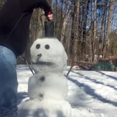 Man lights a small cannon in the snow, it fires and destroys a snowman a few feet away. Snowman's head blows off. On 2nd take, whole snowman explodes. Winter.