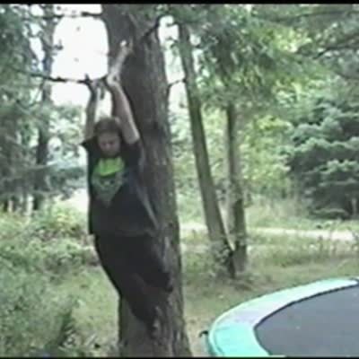 Teen boy hangs from tree limb, the branch breaks & boy falls down, gets hit in the head with a stick.