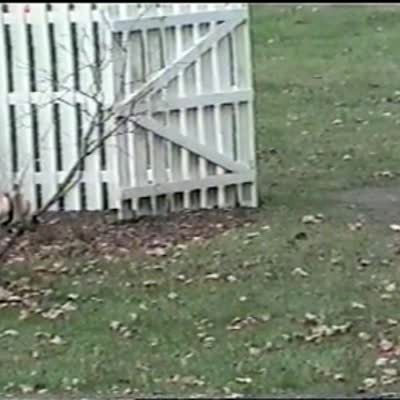 Dog runs through an opening in a gate which breaks a large tree branch he holds in his mouth.