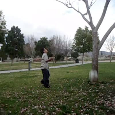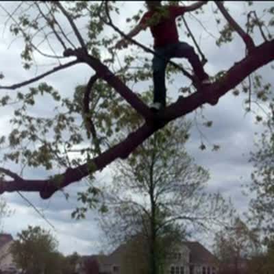 Teen boy climbs out onto a narrow tree branch at the park, he tries to jump and swing from the limb. Branch breaks, boy falls to the ground. Bonehead.