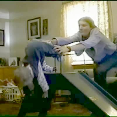 A man pushes a tree back and forth. A woman off camera jokes about having to "take him to the hospital." The tree breaks and almost falls on the man and the woman says, "Oh Shit."