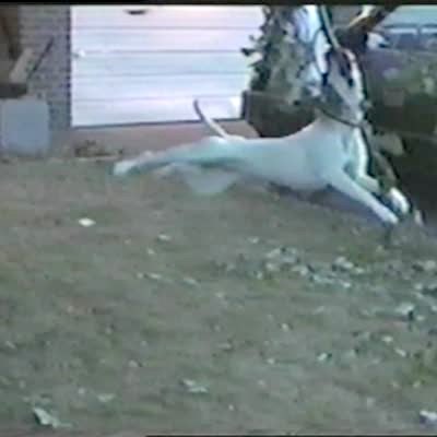 A man standing on his front porch takes his two dogs outside when lightning strikes a tree limb causing it to fall down into the yard. The large branch luckily doesn't hit his nearby dog.