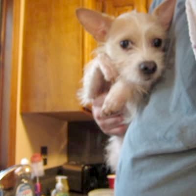 Shaggy brown dog kicks leg as woman brushes its side on couch. UGC-EP experienced an error.