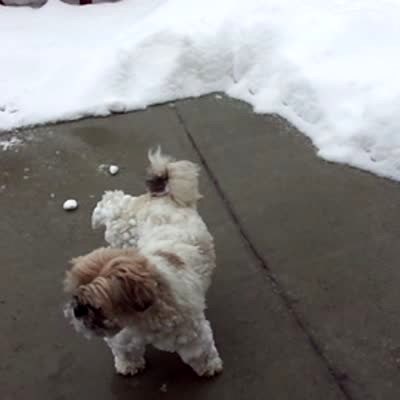 A small dog stands outdoors in the snow when a man tells her to come inside and she lifts one of her legs that's covered in snow balls and limps inside on three legs.