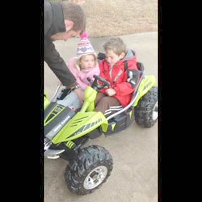 A dad is trying to show his five year old boy how to reverse his four wheeler. The boy drives into the dad's shin and laughs as the dad limps off.