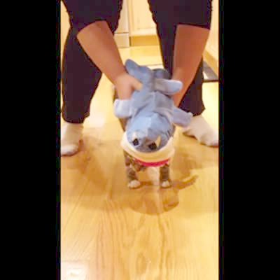 A cat falls over limp while it wears a shark costume. A woman stands the cat up and it falls over again. Pet costume. Halloween