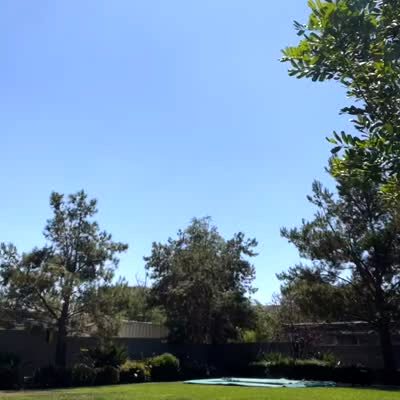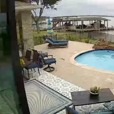 Home security footage of a man who limps when he stands up after he trips and falls over the side of a swimming pool while he cleans it. No sound.