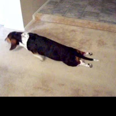Hound dog drags its hind legs through the hallway and into the den, moving very slowly.