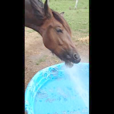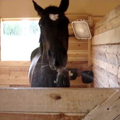 A horse smacks his lips at the stream of water from a hose as he tries to catch it in his mouth.