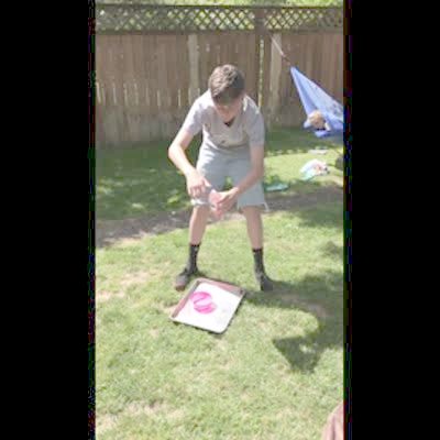 Teen boy jumps on a water bog bubble on a golf course. Man pops it and the water pours out the side.