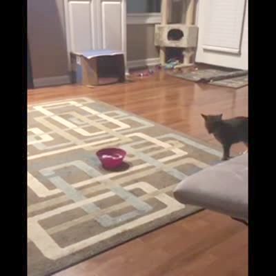 A cat jumps around a bowl of ice water in the living room while she swats at it after she drinks out of it. No sound.