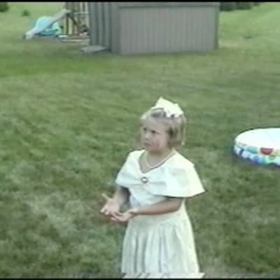 Tot girl in dress catches water balloon and it bursts all over her and drenches her.