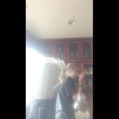 A woman shakes a bottle as the liquid inside makes a chemical reaction, then she unscrews the lid and the liquid fizzes. She says she's disappointed, then shakes the bottle again and it explodes in her kitchen.