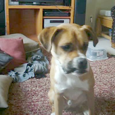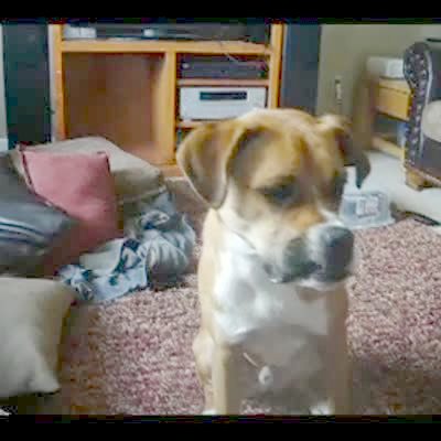 Boxer dog has water bottle sprayed in its face in the living room, dog takes a drink. SAME CLIP AS 631295 ON 4O-09.