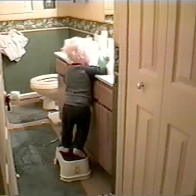 Tot boy fills a cup with water and dumps it on the floor. Then he falls off the stool onto the floor.