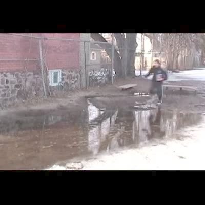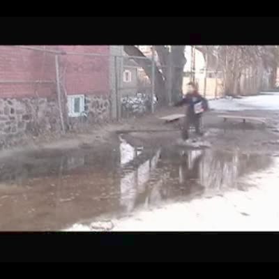 Teen boy in black sweat pants runs and falls into a huge puddle of water