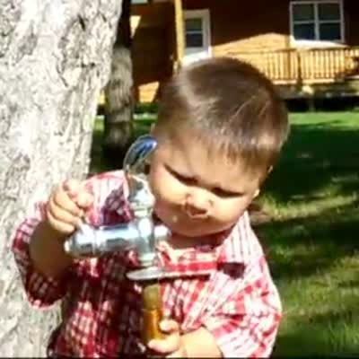 "Fountain of Youth" Tot boy can't figure out how to work the water fountain. He takes a drink at the end.