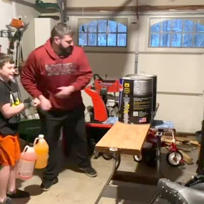 A man has a young boy holds up two heavy jugs of liquid, and then balances a plate of whipped cream on his hands. The man then cuts the rope the jugs are on, and the boy hits himself in the face with the plate and cream.