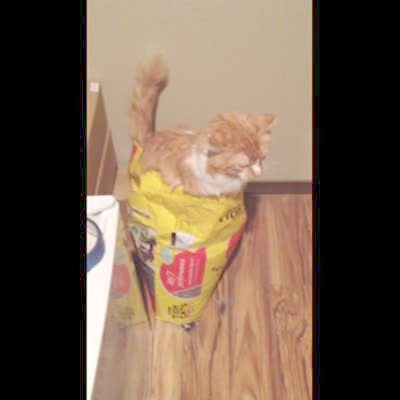A fluffy orange cat climbs into a bag of kitty litter and goes to the bathroom in it.
