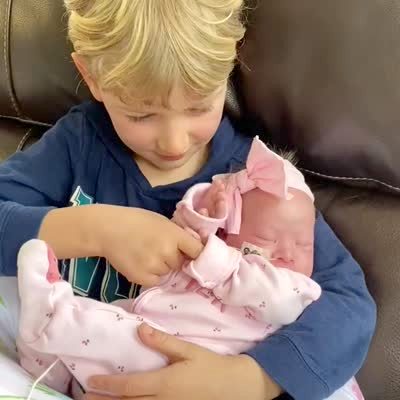 A young boy holds his baby sister for the first time and says "she's so tiny, like a little cockroach" in a living room.