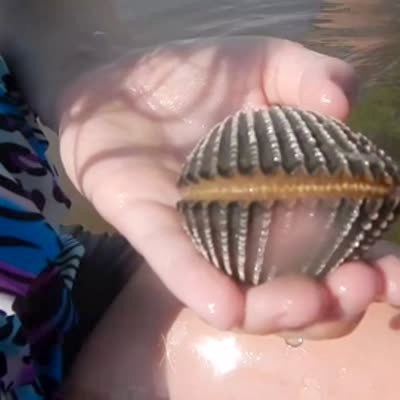 A young girl holds a clam. The clam opens a little. The girl dumps water on it. The clam comes out of the shell and touches the girls hand. She shrieks and throws the clam back into the ocean.