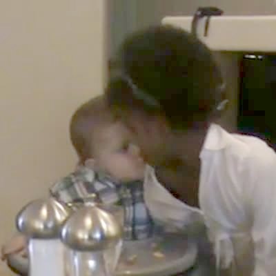 Baby boy wants to kiss older girl and pulls her shirt to get her to come closer so they can kiss some more. Cute, love.