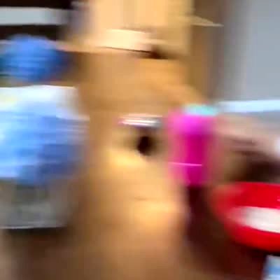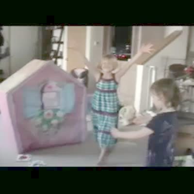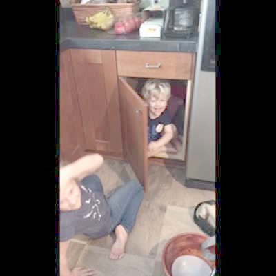 A young girl plays three little pigs with her little brother inside a kitchen cabinet and as the girl says she will blow the house down, the boy opens up the cabinet door and hits her in the face.