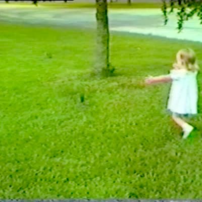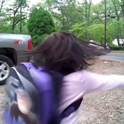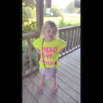 A little girl spins around outside and says, "Tom Bergeron." She loses her balance a little and almost falls.