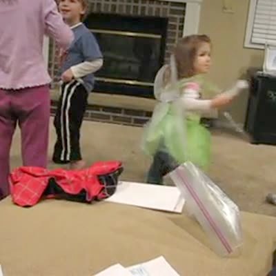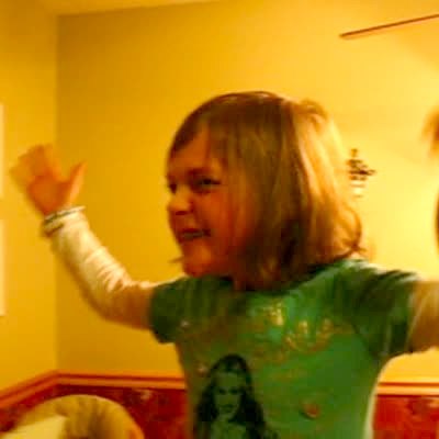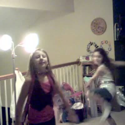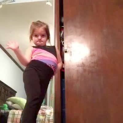 Three little girls dance around the bedroom, one girl does a cartwheel and kicks her friend in the face. The other girl just keeps dancing.