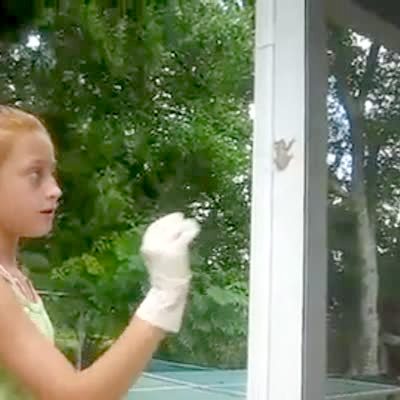 Little girl holds frog with a gloved hand in the backyard, the frog jumps on girl's head and she freaks out.