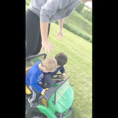 A teen girl stands up on the back of a power wheels car while two little boy drive it in a field outdoors. The car makes a sudden stop and the girl falls off the car and then the car continues.