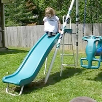 Little girl jumps off a slide in the backyard and lands on her butt. She cries.
