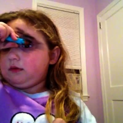 "Little Miss Makeup Mess" - A young girl does a DJ Tanner makeup tutorial. She gets eye liner all over her face and tries to fix it by using more make up. When her father walks in she tries to cover her eye with her hand and then says "I'm not a good artist" when father scolds her for having made a mess.