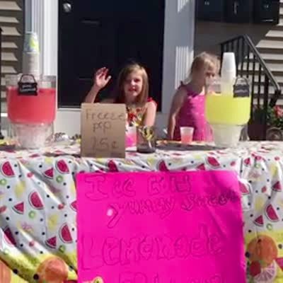 A young girl and her little sister sing a song about lemonade at their first lemonade stand and then the table collapses and the older girl says, "I knew that would happen," and the younger girl cries.