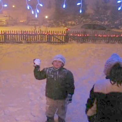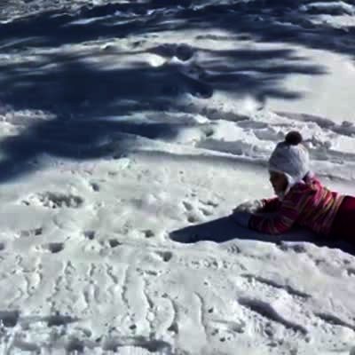 Girl & boy play in the snow. Girl throws a snowball at the house & a big mound of snow hits her in the face, she laughs. Winter.