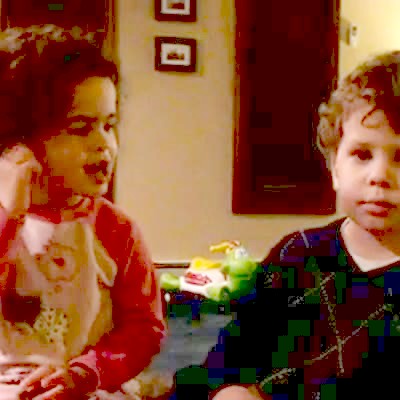 Little boy and girl sing Christmas carols. Girl interrupts boy, boy pushes girl over. Sibling rivalry.