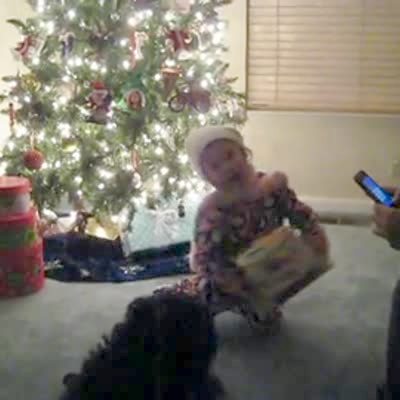 Little girl looks at her Christmas present and doesn't know what it is. Dad asks what it says on the box and girl says "Made in China." Kids say.