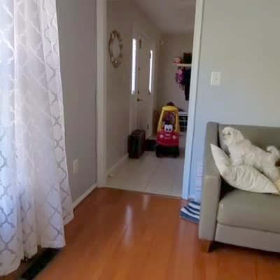 A tot girl pushes her younger sister in a Little Tikes car through a house and crashes her into the couch.