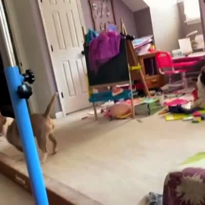 "The Running of the Bulldog" A dog chases a balloon around a little girl's bedroom and knocks over anything in it's path.