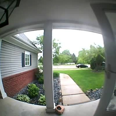 "Tot Can't Find Mail Slot" A woman tries to direct her young daughter to put card in her grandmother's mail slot. The little girl wanders back and forth in the driveway but can't find it. .