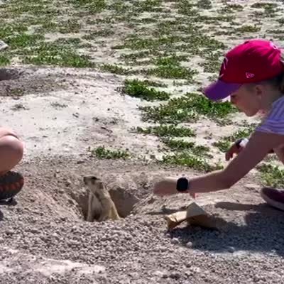 "Little Thief on the Prairie" A young girl and boy feed a prairie dog in a field, but it runs out of its hole and steals their bag of food.