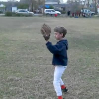 Little boy tries to catch a baseball, it bounces off his head. Called submitter to ask for more footage. Short clip (:07).