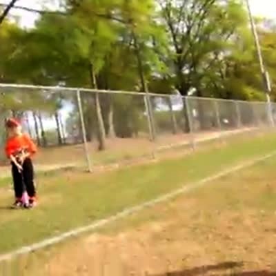 Girl practices hitting baseballs. Hits the camera with one immediately after saying "this has the makings of an America's Funniest Video"